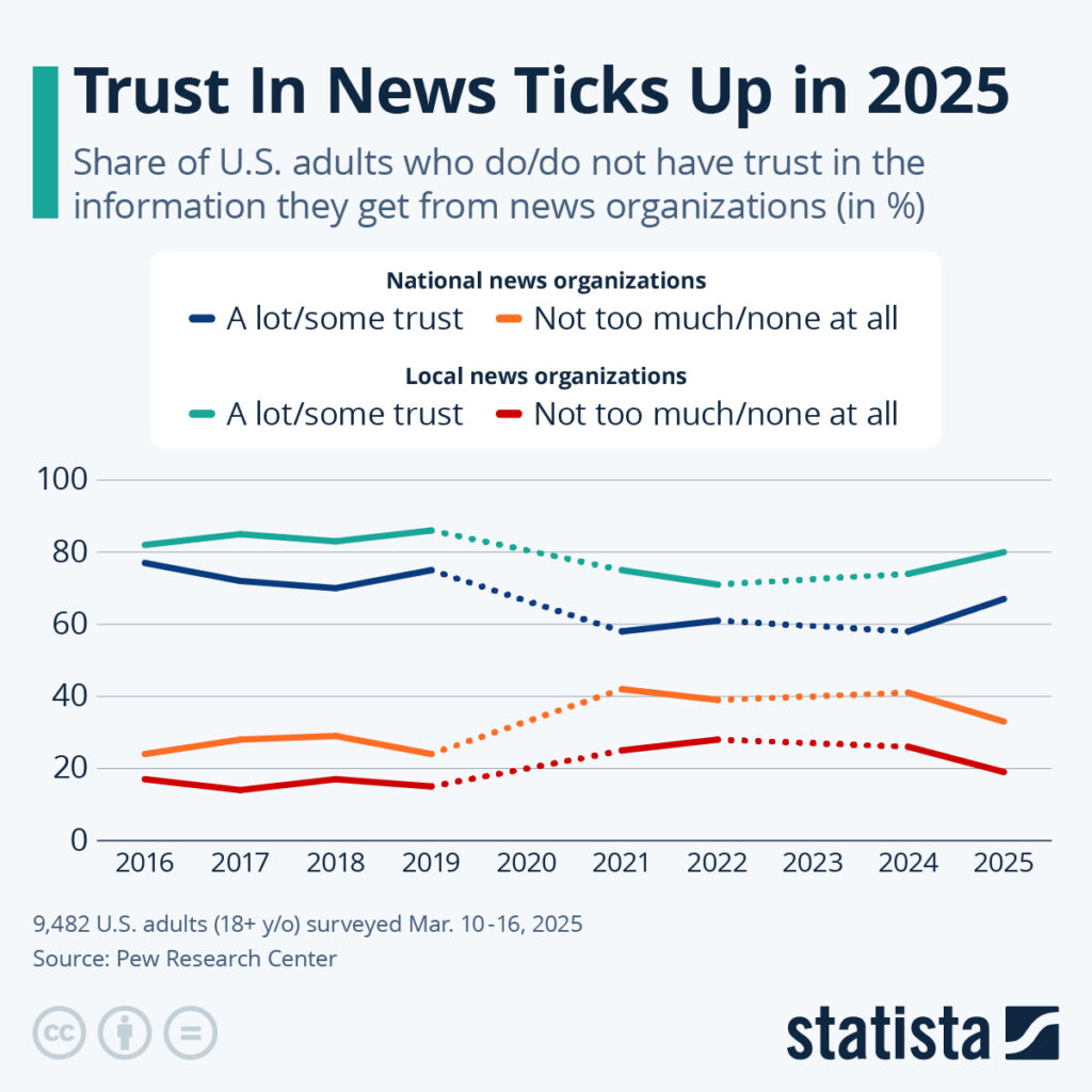 Notably, trust varies sharply by platform. Traditional broadcasters continue to outperform digital-only publishers. According to the same report, BBC News remains the most trusted major news source in the UK, while trust in news encountered via social media platforms falls below 25 per cent. This distinction highlights that the issue is not rejection of journalism itself, but scepticism towards how and where news is distributed.